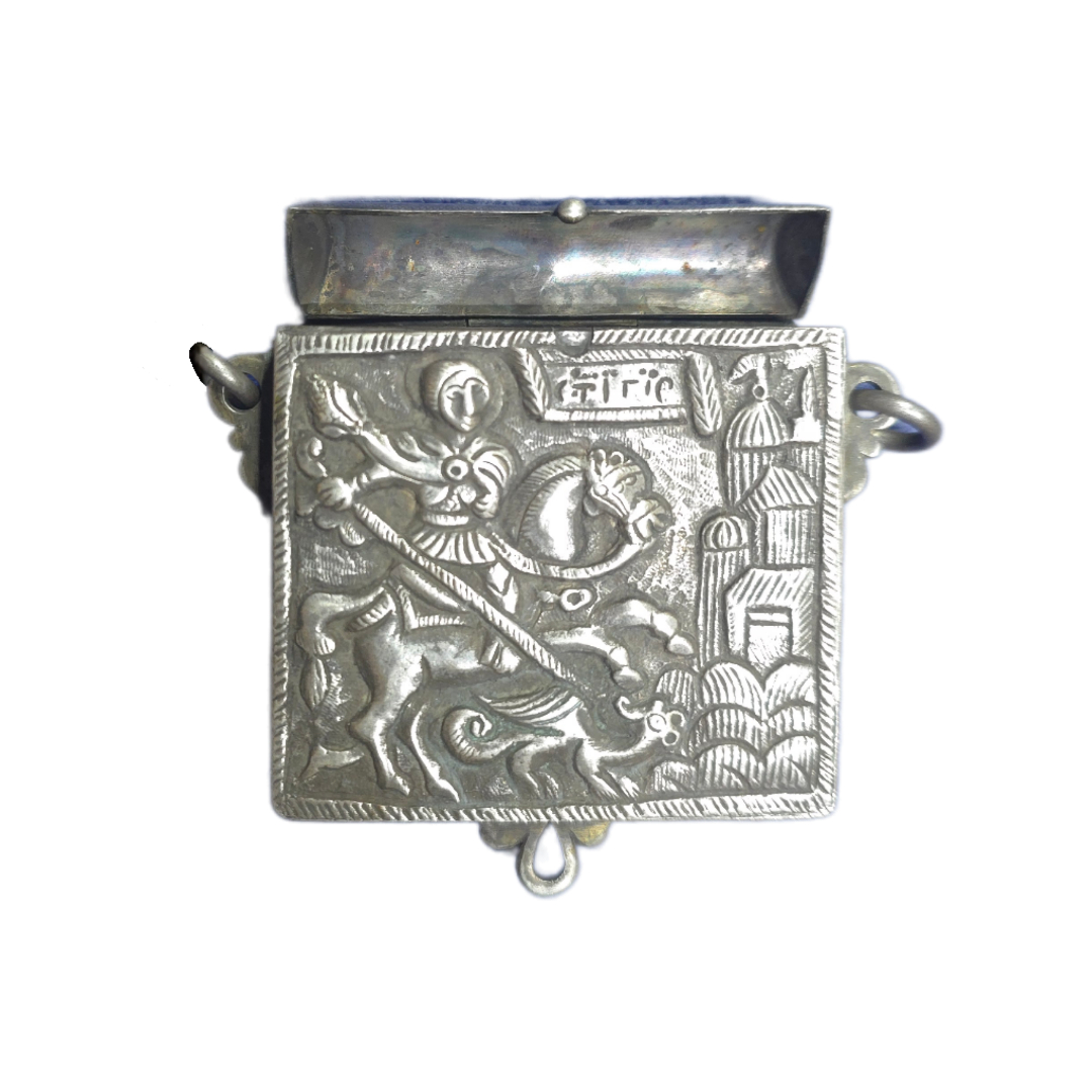 Φυλακτό ασημένιο με παράσταση του Αγίου Γεωργίου σε έφιππη μορφή, εντός ορθογώνιου κουτιού-θηκαρίου με ανάγλυφη διακόσμηση και εγχάρακτες λεπτομέρειες.
