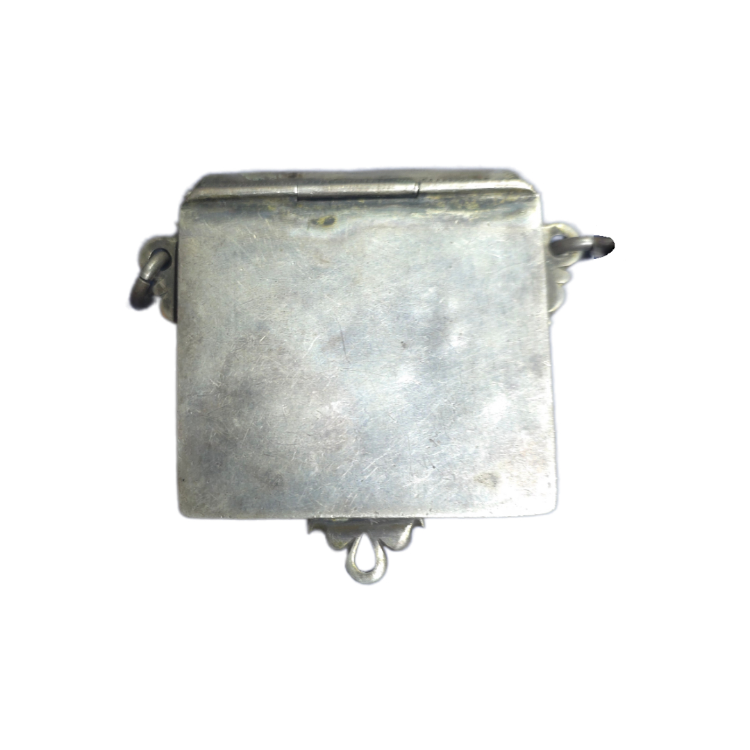 set within a rectangular locket-type case with repoussé decoration and engraved details.