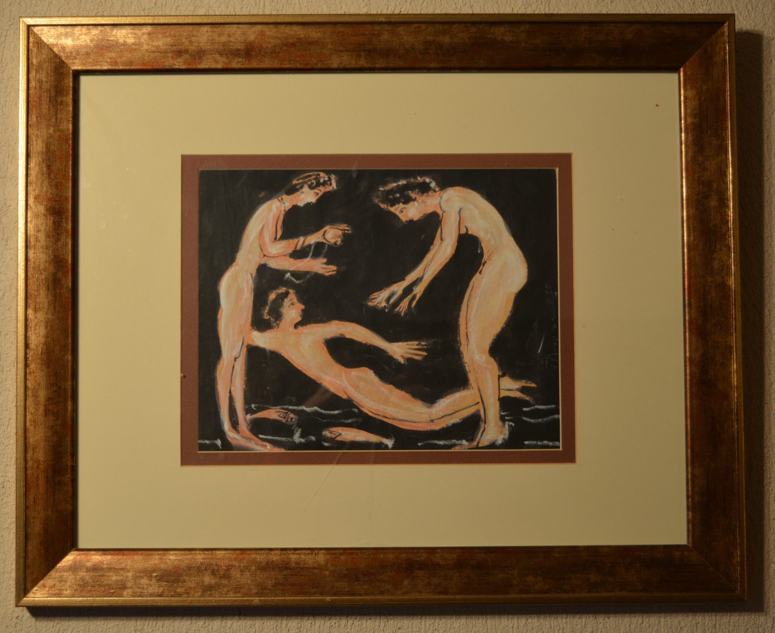 Painting of Lazaros Pantos, “Black-figure” series (in reference to reference to the famous ancient pottery painting technique), mixed media on paper. The series is included in a special edition for this lost art, and the potential buyer will also be provided with a catalogue signed by the artist. Dimensions of frame: 50cm (width) x 40cm (height). Dimensions of artwork: 24cm x 20cm.