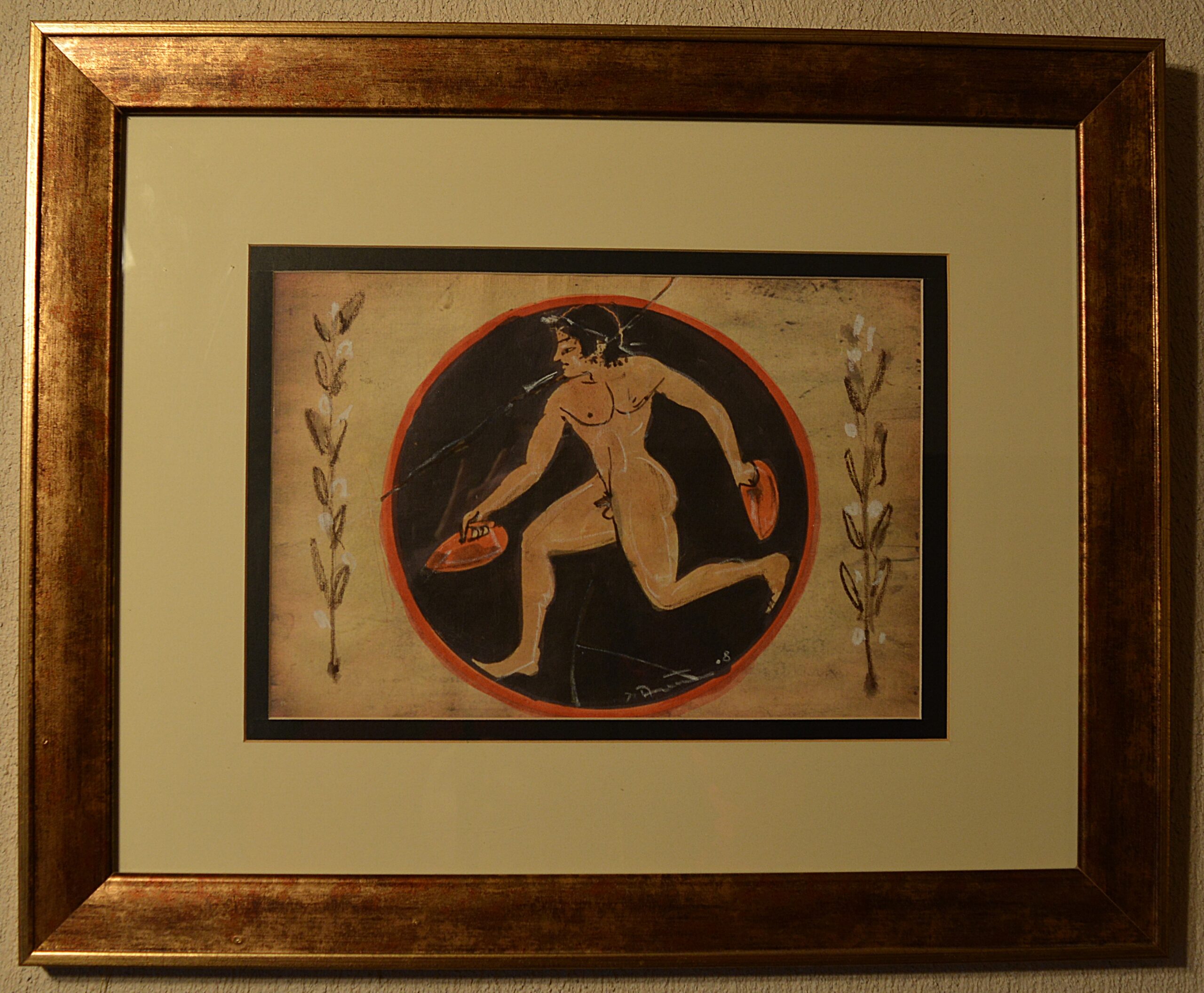 Painting of Lazaros Pantos, “Black-figure” series (in reference to reference to the famous ancient pottery painting technique), mixed media on paper. The series is included in a special edition for this lost art, and the potential buyer will also be provided with a catalogue signed by the artist. Dimensions of frame: 50cm (width) x 40cm (height). Dimensions of artwork: 28cm x 20cm.