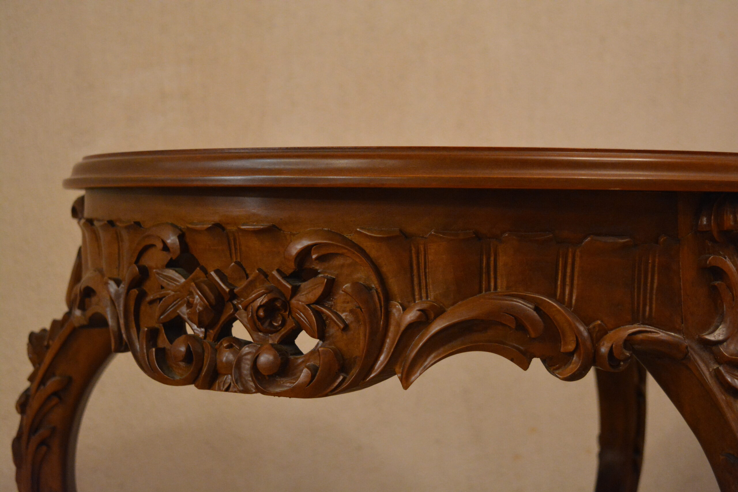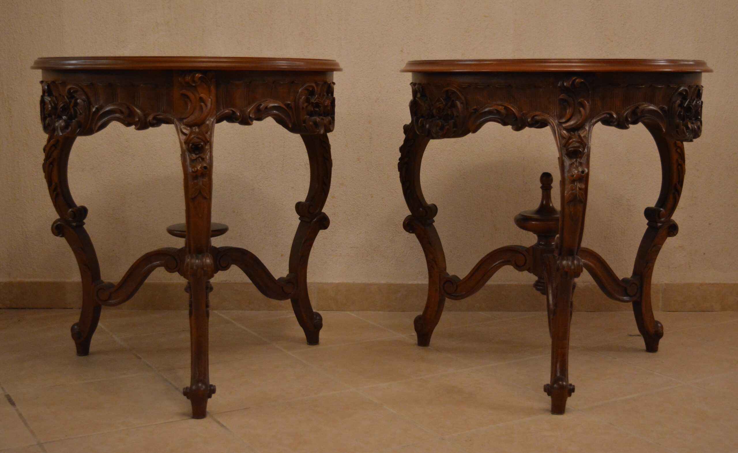 Δύο τραπέζια σκαλιστά, από καρυδιά, δουλειά του Ξυλογλύπτη Κωστή. Διαστάσεις: 63εκ (ύψος) x 61εκ (διάμετρος) το καθένα.