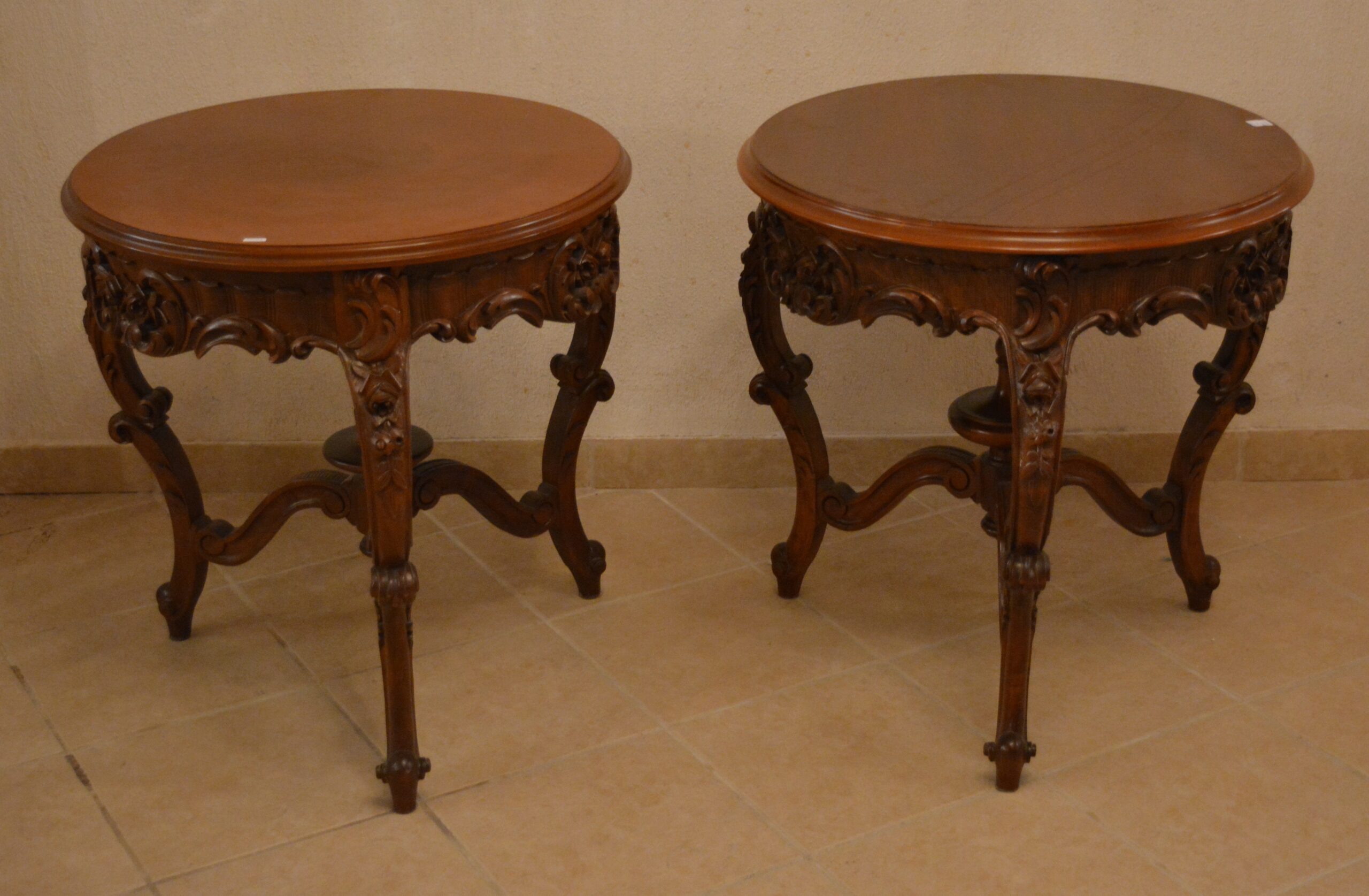 Two carved tables, made of walnut, by the woodcarver Kostis. Dimensions: 63cm (height) x 61cm (diameter) each.